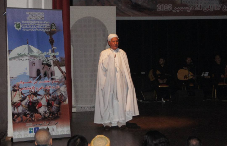 وتميز حفل افتتاح هذه التظاهرة الثقافية الذي أقيم بالمسرح الجهوي الجيلالي بن عبد الحليم بتقديم تركيب فني من إخراج أمين شيخ تضمن عدة مقاطع شعرية لثلة من الشعراء الجزائريين امتزجت خلالها الكلمات الوطنية بالموسيقى الملتزمة. وقال اسماعيل ابرير ممثل وزيرة الثقافة والفنون مليكة بن دودة في كلمته الافتتاحية للتظاهرة أن لهذا المهرجان الوطني امتدادات في الثقافة وفي صناعة وصياغة المعنى للشعب والأمة الجزائرية ولاسيما أنه أصبح الموعد الذي يوحد الجزائريين الذين لا يختلفون في أي شبر من الوطن حول هذا الجنس الفني الاستثنائي. وأردف ذات المتحدث أن الشعر الملحون هو هوية ماثلة من خلال ما نجده فيه كما أنه مصدر مهم لحوادث التاريخ ومشكاة للقيم والمبادئ التي تشربها آباؤنا وأجدادنا ويجب علينا اليوم الحفاظ عليها. وقامت محافظة المهرجان خلال هذا الحفل بتكريم الفنان مصطفى بوخروبة والباحث في التاريخ عبد القادر فاضل نظير إسهاماتهما في الحفاظ على هذا الموروث الثقافي وتعميق الأبحاث التاريخية حوله. وتم خلال هذا الحفل عرض فيلم وثائقي تم إنجازه خصيصا لهذه الطبعة بعنوان “سيدي لخضر بن خلوف..الأثر في وجدان الناس وفي الوطن” من إخراج الطاهر خوصة. ويتضمن برنامج المهرجان الثقافي الوطني للشعر الملحون تنظيم ملتقى دراسي وطني بعنوان “سيدي لخضر بن خلوف المعلم التاريخي وآليات التثمين الثقافي” بدار الثقافة ولد عبد الرحمن كاكي وتنظيم الجمع السنوي للولي الصالح بقرية سيدي لخضر بن خلوف فضلا عن ثلاث سهرات فنية بما في ذلك حفلا الافتتاح والاختتام.
